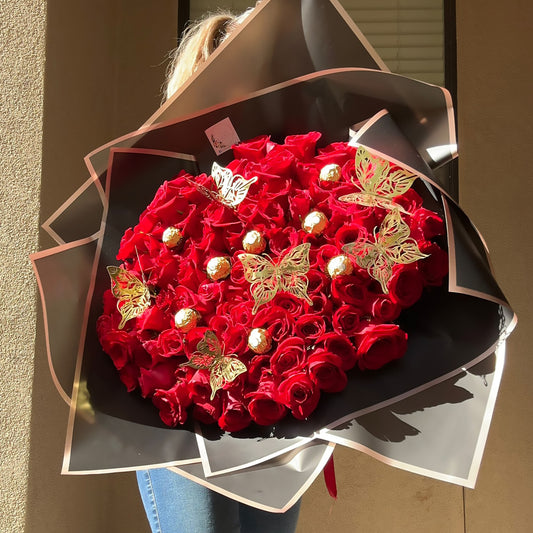 Ramo de 100 Rosas con Chocolates y Mariposas