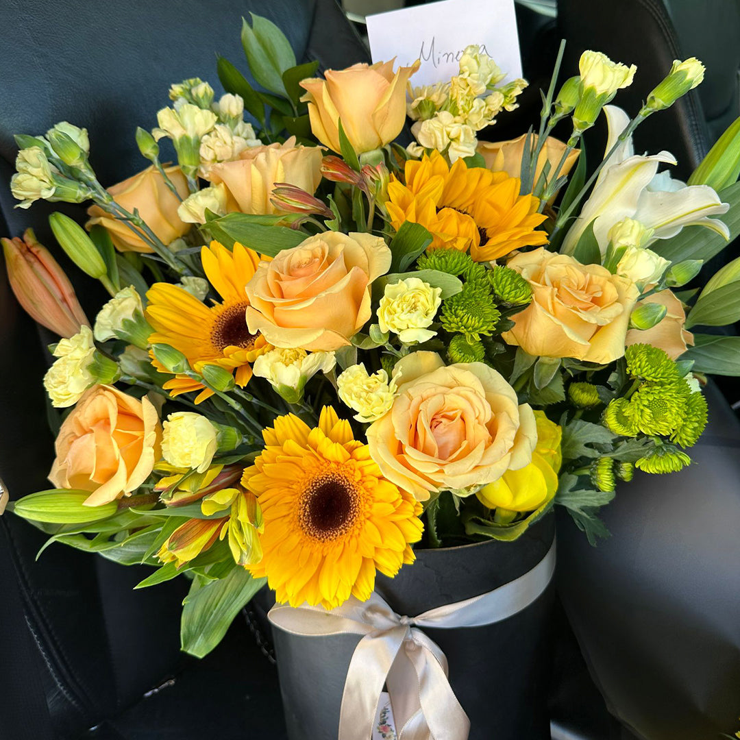 Un radiante arreglo de flores frescas de temporada en vibrantes tonos amarillos, que transmiten alegría y energía. Presentado en una elegante caja, este diseño es perfecto para iluminar cualquier ocasión especial o para llenar de calidez y frescura cualquier espacio.