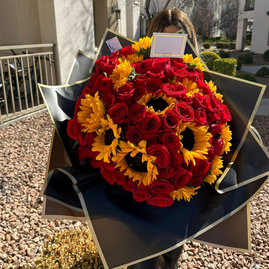 Un impactante ramo de gran tamaño que combina la majestuosidad de los girasoles con la elegancia de las rosas rojas. Perfecto para sorprender en grandes ocasiones y expresar tus sentimientos de manera única y memorable. 🌻❤️